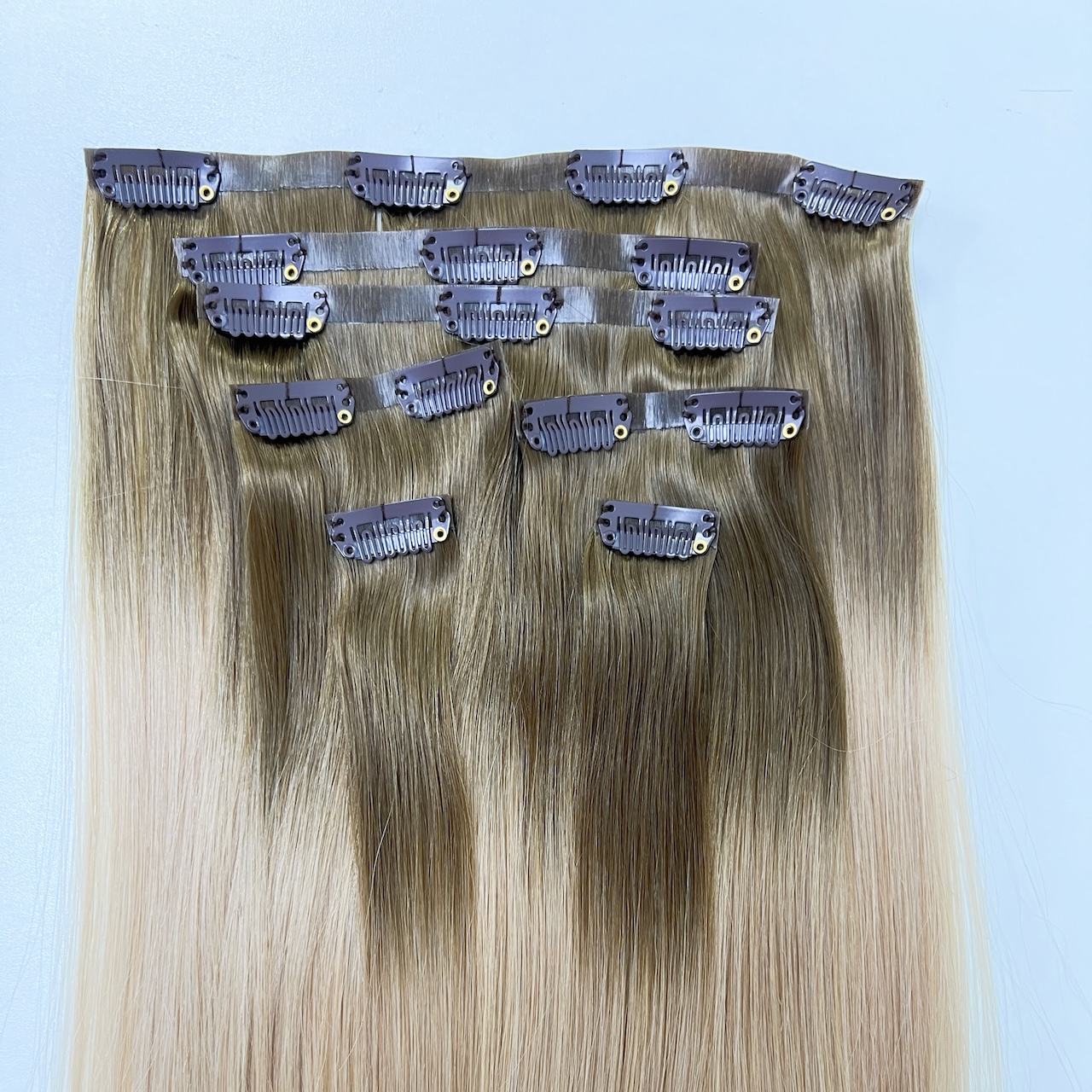 The top uses the same technique as the tape in hair, and then adds clips to make in clip hair. The top is very light and comfortable, and it looks very natural.